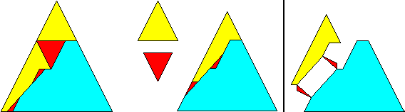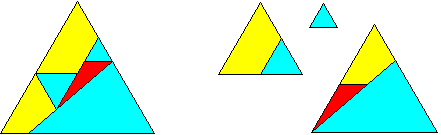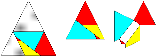 Hingeable solution for 6-piece dissections of triangles with x² + y² + z² = w² ; x + y = w ; (compare solution 5.3, page 279 in Dissections Plane & Fancy ). I chose this solution because it is cyclicly hinged, but there are at least two other hingeable solutions existing that both use a T-strip in order to transform a parallelogram to a triangle.